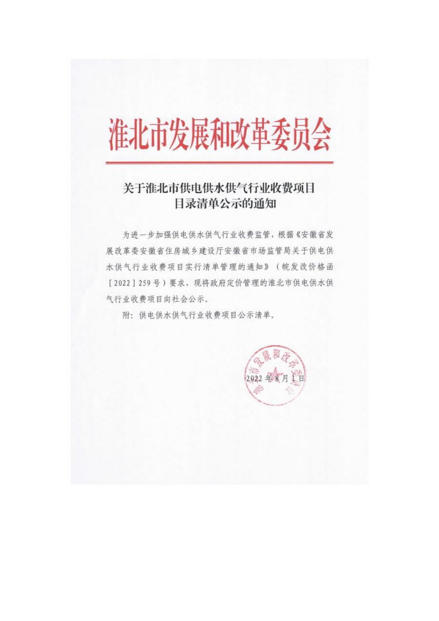 關(guān)于淮北市供電供水供氣行業(yè)收費(fèi)項(xiàng)目目錄清單公示的通知