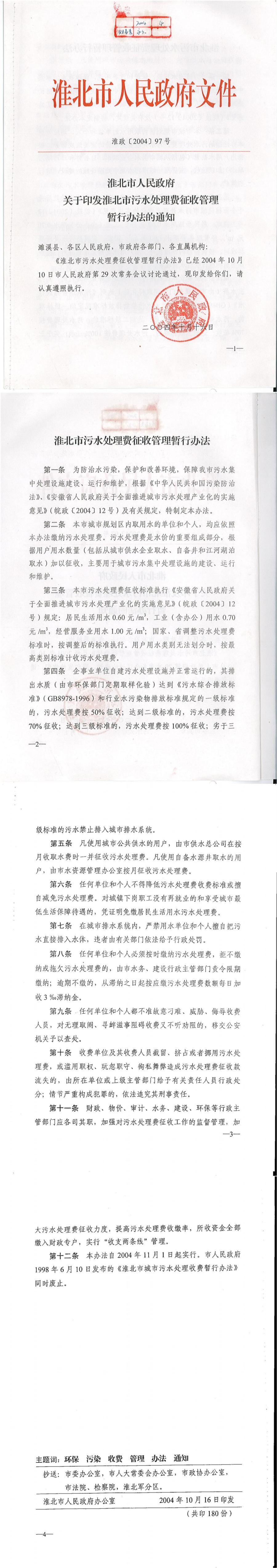 淮北市人民政府關于印發淮北市污水處理費征收管理暫行辦法的通知 淮政【2004】97號
