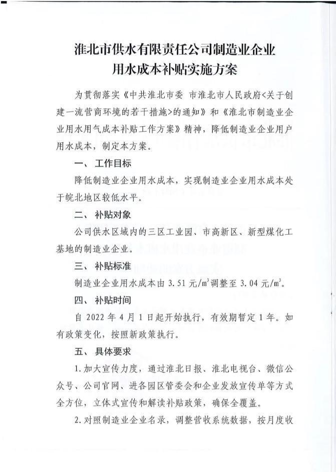 淮北市供水有限責任公司關于印發制造業企業用水成本補貼實施方案的通知 淮供水字【2022】24號