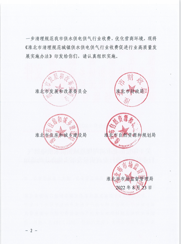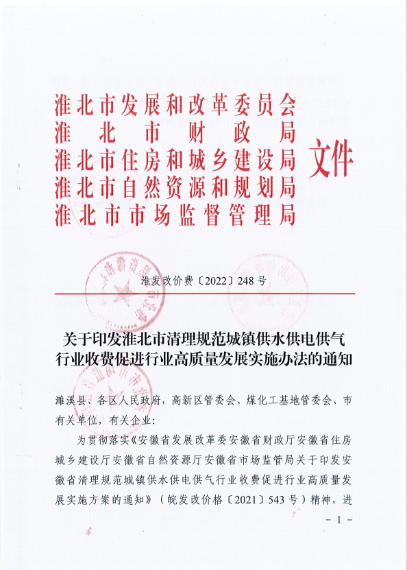 關(guān)于印發(fā)淮北市清理規(guī)范城鎮(zhèn)供水供電供氣行業(yè)收費(fèi)促進(jìn)行業(yè)高質(zhì)量發(fā)展實(shí)施辦法的通知 淮發(fā)改價(jià)費(fèi)[2022]248號(hào)